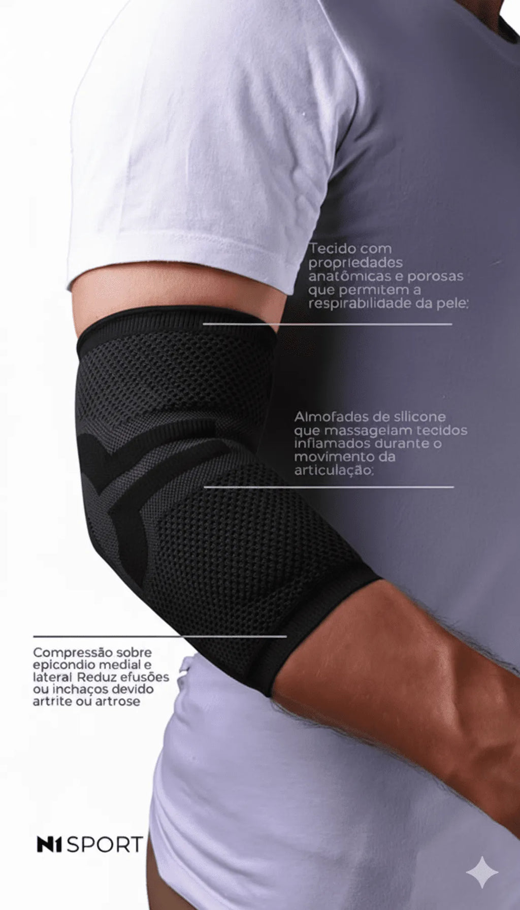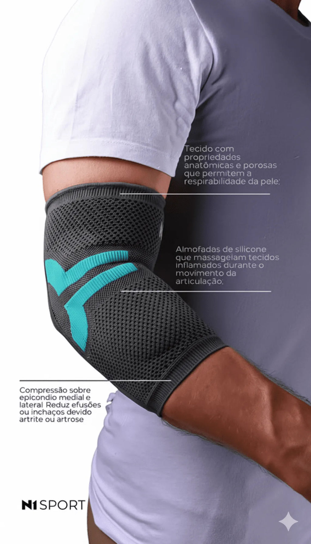 Indicação de uso: Auxilia no tratamento e prevenção de lesões no cotovelo. Uso ortopédico ou para práticas de esportes.
